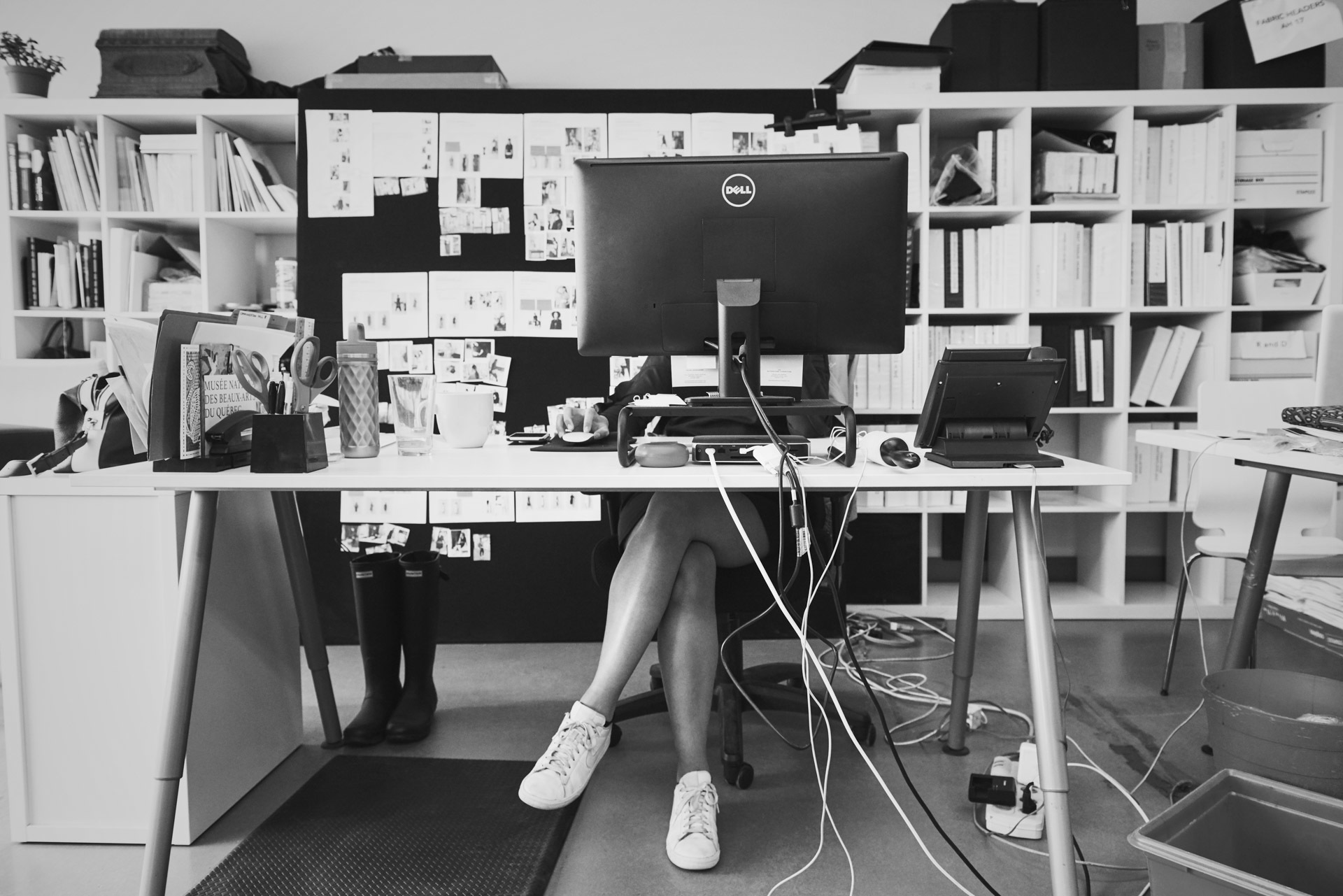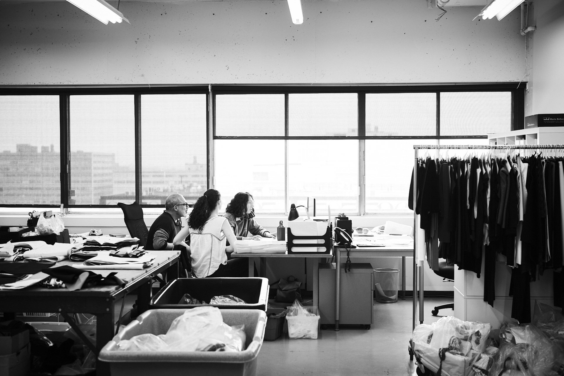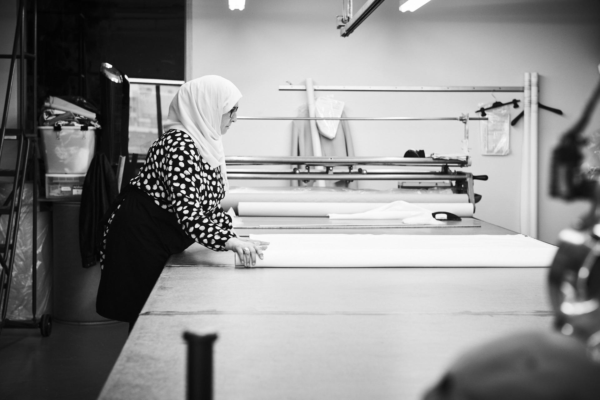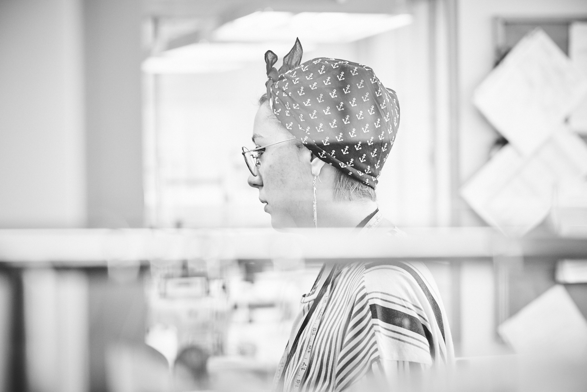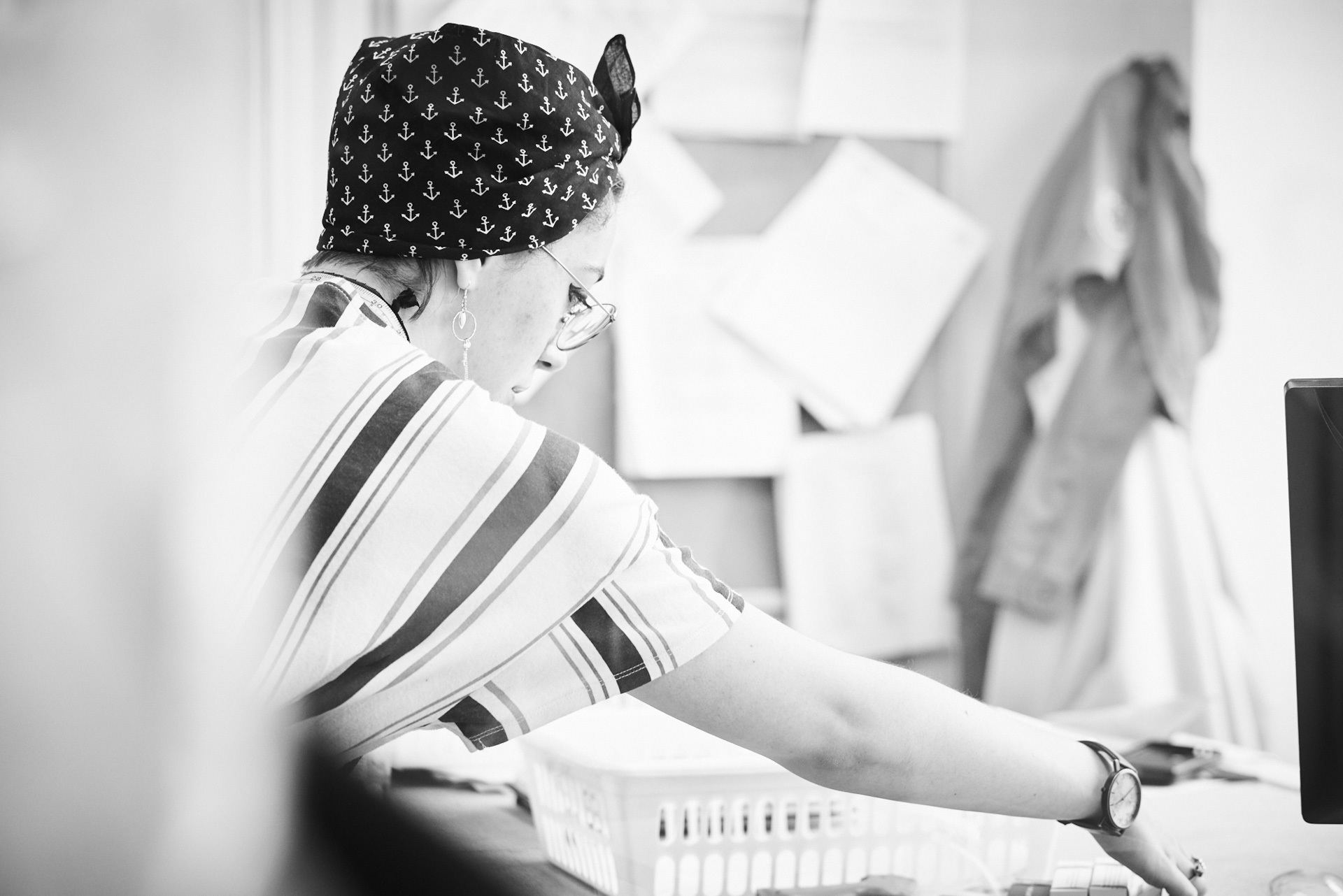 derrière ces imposantes lunettes, se dessine l'une des créatrice de mode les plus en vue à montréal. tout en simplicité et souriante, elle nous fait découvrir son atelier de travail.